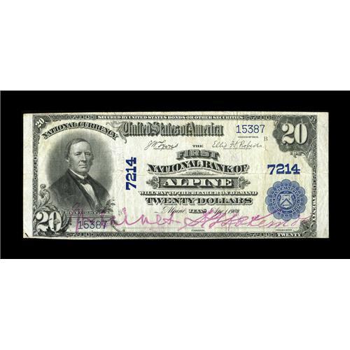 <B>Alpine, TX</B></I> - $20 1902 Plain Back Fr. 650 <B>The First NB</B></I> Ch. # 7214<BR>We sold another $20 Plain Back from here, also in the <B>Very Fine</B></I> grade applicable to this offering, in our 2001 Florida United Numismatists Signature Sale. That example was not as visually appealing as tonight's example. This locale from Brewster County never seems to have quite enough notes available to satisfy the appetites of the Texas collecting fraternity. We anticipate that the realization from six years ago will be but a starting point for bids tonight and will likely be quite handily surpassed when the hammer falls.<BR><BR><b>Shipping:</b> Coin/Currency (<a target="_blank" href="http://www.heritageauctions.com/common/shipping.php">view shipping information</a>)