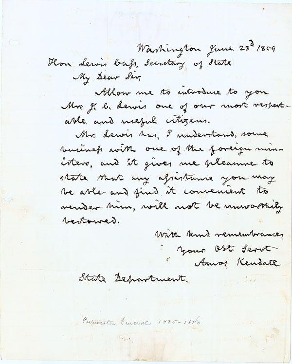 AMOS KENDALL A journalist, Kendall also served as Jackson and Van Buren’s Postmaster General. ALS signed by Amos Kendall to Lewis Cass. 1 page. Washington, June 23rd, 1859. 8” x 10”. Letter of recommendation for J.C. Lewis and signed by Amos Kendall. Two punch holes at left border. Ideal for framing.
