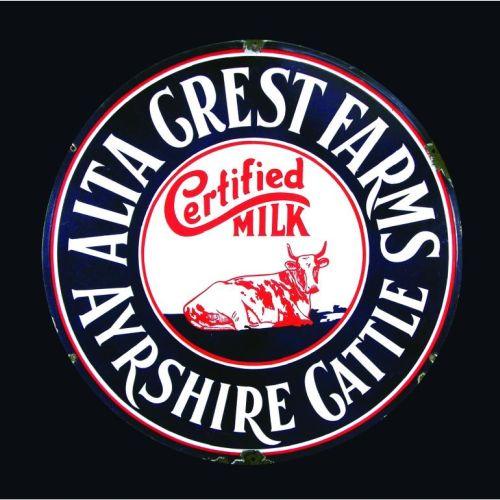 Alta Crest Farms for Ayrshire Cattle Porcelain Sign, certified milk. A few chips around the edges otherwise excellent condition. 24 inch diameter.