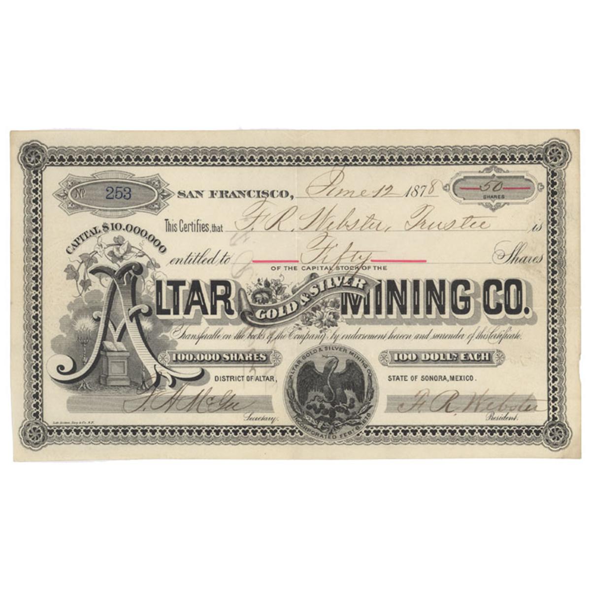 1878, California. Stock certificate for 50 shares. Black. Vignette at bottom center of the Mexican emblem of an eagle holding a snake in its beak. Vignette of an altar with candelabra within the title. Mines located in the district of Altar, State of Sonora, Mexico. Uncancelled and very fine.