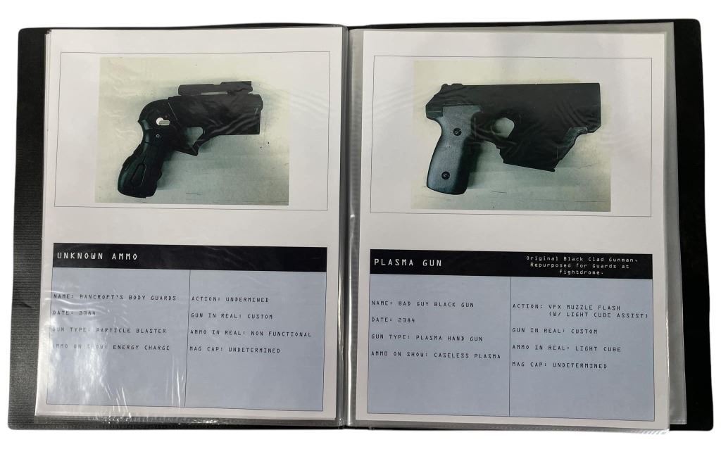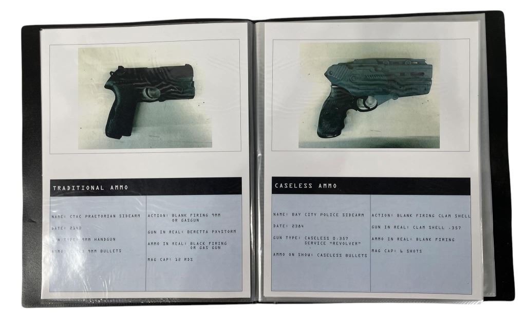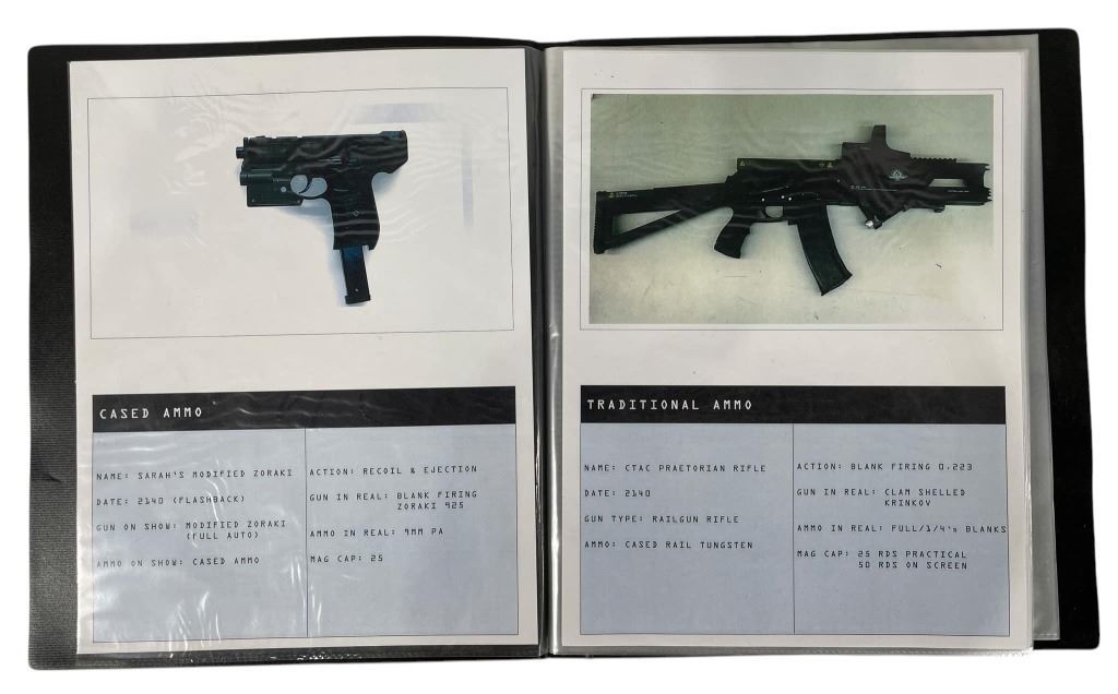 Original season 1 weapons photo folder with 18 pages used in the production of the cyberpunk television series 'Altered Carbon' (2018 - 2020), based on the 2002 novel of the same title by English author Richard K. Morgan.