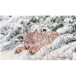 Artist: Tom Beecham | 1926-2000 SAHA, SAA Title: Snow Cat Signed l/r: T Beecham © '93 Medium: Oil on linen Dimensions: 8 by 13 inches Co...