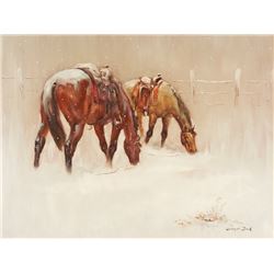 Artist: George Dick | 1916-1978 Title: Slim Pickins Signed l/r: George Dick Medium: Oil on panel Dimensions: 18 by 24 inches Condition: Very Good T