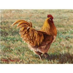 Artist: Rick Morris Patterson | b. 1958 Title: Linda's Rooster Signed l/l: R. Morris Patterson © 2000 Medium: Oil on panel Dimensions: 9 b...