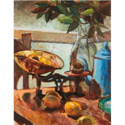 Artist: Julian Robles | b. 1933 Title: Lemons and Scale Signed l/r: Julian Robles 69 Medium: Oil on canvas Dimensions: 20 by 16 inches Condition: E