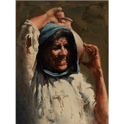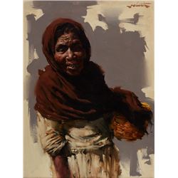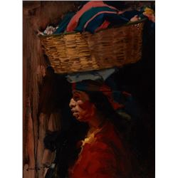 Artist: Clarence McGrath | b. 1938 Title: The Water Carrier Signed u/r: McGrath Medium: Oil on masonite panel Dimensions: 24 by 18 inches Condition