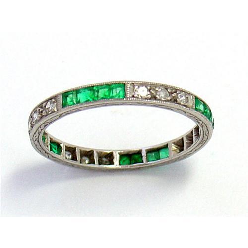 Vintage 1930s platinum band. Set in an alternating manner with four times four square cut emeralds, and four times three round full cut diamonds. The band is beautifully engraved on both sides, it is 2.5 mm wide, and the size is 6.5. Total diamond weight is approximately .50ct, F-G color, VS quality. Total emerald weight is approximately .70ct