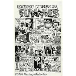 <B>Alternative Media Comics and Stories #nn with Poster (Rip Off Press, 1972) Condition: NM.</B></I> This rarely seen item was a giveaway minicomic produced in conjunction with a "Comics and Mass Consciousness" Goddard College conference from 1970, which featured Stan Lee and Harvey Kurtzman as special guests. The comic consists of eight 7" x 8.5" unstapled pages, and was hastily drawn by Gilbert Shelton, who tossed in a quick <B>Freak Brothers</B></I> strip you won't likely see reprinted. Included at the time (and with this lot) was a "jam" poster, <B>Saturday Mindfuckee Funnies</B></I> with art by Shelton, Kurtzman, and Art Spiegelman. Both items were marked with a thumbprint of authenticity by conference attendee Bill Desmond. These extremely scarce items are seldom found in high grade. 2 items <BR><BR><B>Important notice:</B> Heritage usually auctions material at the rate of 200-250 lots per hour. On some occasions eBay Live bid software or the Internet may not be able to keep up with the pace of the auction. We recommend placing a realistic absentee bid now as insurance to avoid disappointment. Occasionally the auctioneer may eliminate or reject an eBay Live bid, and the auctioneer may also reopen a lot after the close of the eBay live bidding (usually because we missed an audience bid), and may reject your bid even if it shows you as the winning bidder. By bidding via eBay Live, you agree that Heritage may award the lot to another bidder at its sole discretion under the circumstances described above or any other reasonable circumstances. Since eBay bids are not shown to us until we open the lot on the floor, we treat those bids just like floor bids. In most cases the floor responds before the eBay bid is presented to us, due to Internet lag time, so for consistency we have made it a policy that floor bids are always considered first over tie eBay live bids. Also please note that all Heritage lots purchased through eBay Live carry a 20% Buyer's Premium. Please make sure you read the Terms and Conditions before you bid.