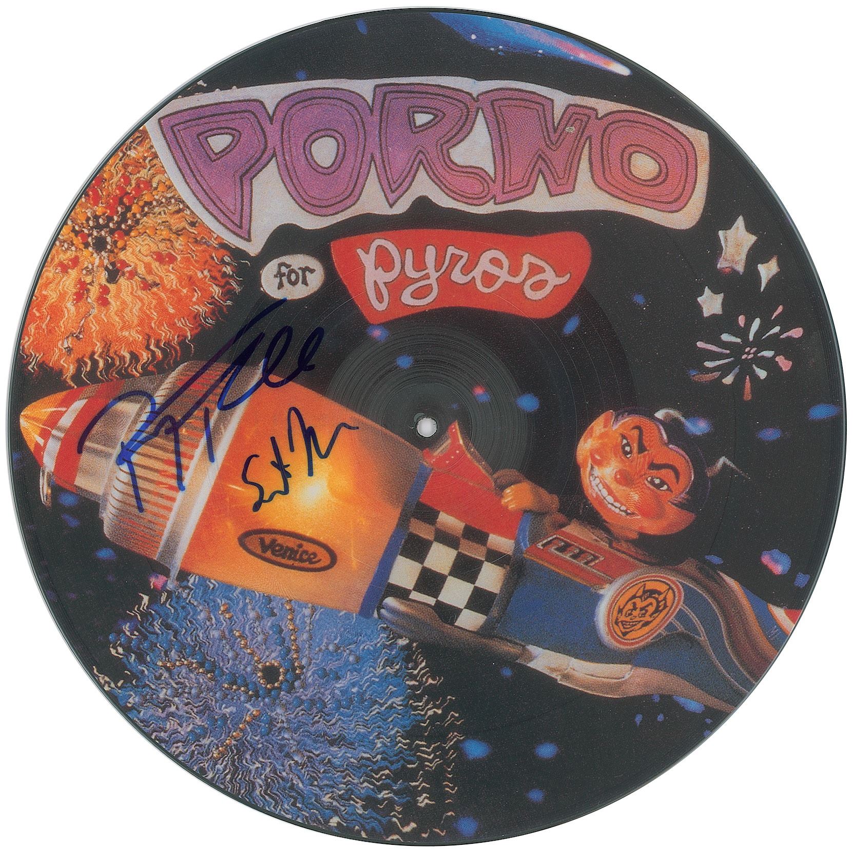 Three items signed by alternative rock artists, including: a Pets 12? picture disc by Porno for Pyros, signed on the disc in blue felt tip by Perry Farrell and Stephen Perkins; The Uplift Mofo Party Plan album by Red Hot Chili Peppers, signed on the front cover in blue felt tip by Flea; and a Ritual de lo Habitual album flat by Jane's Addiction, signed in blue felt tip by Dave Navarro. In fine condition, with a discount cut to the Red Hot Chili Peppers album.