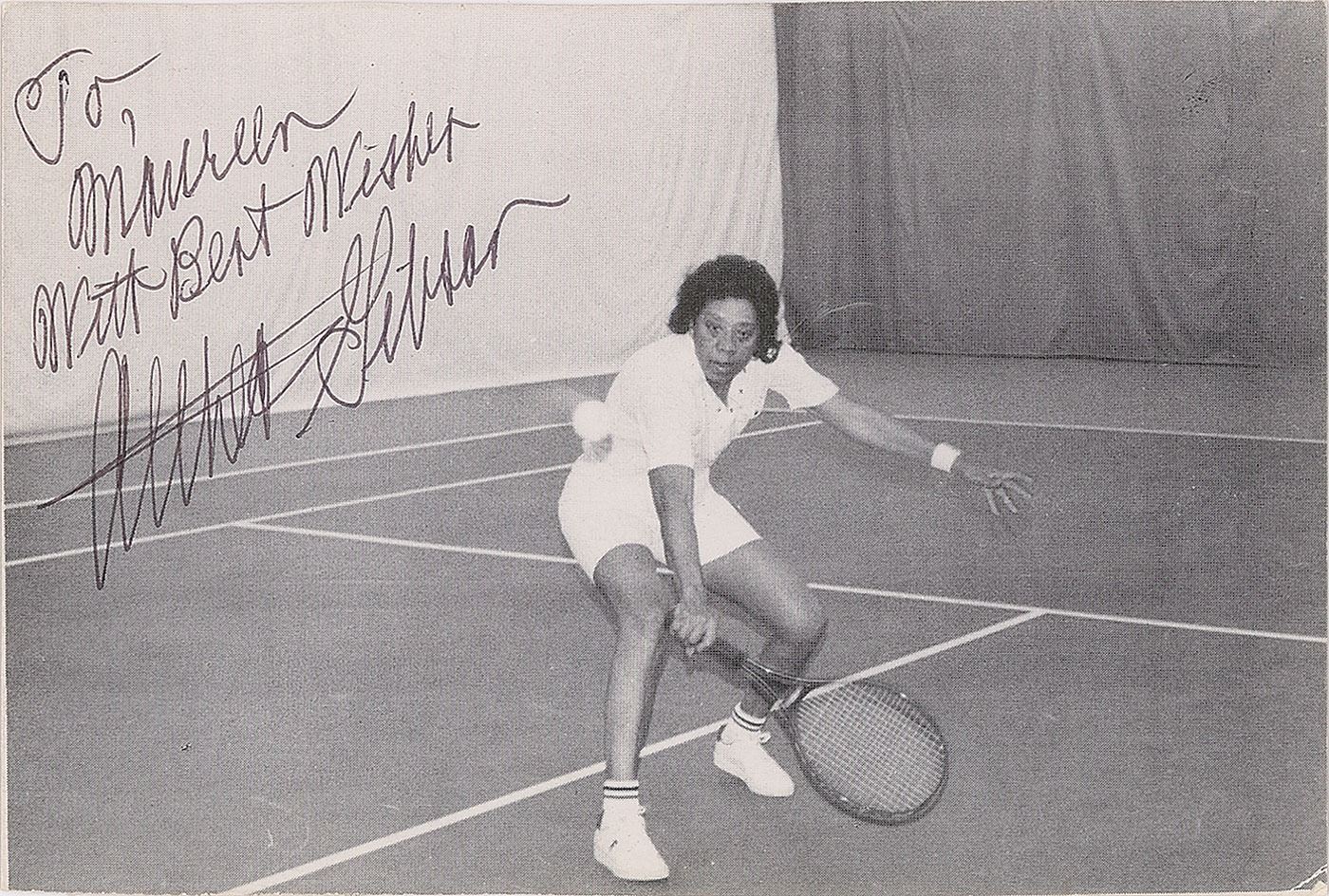 Cardstock 5.25 x 3.5 photo of Gibson playing tennis, signed and inscribed in black ballpoint, "To Maureen, With Best Wishes, Althea Gibson.” In fine condition.