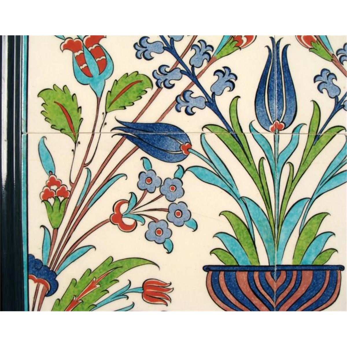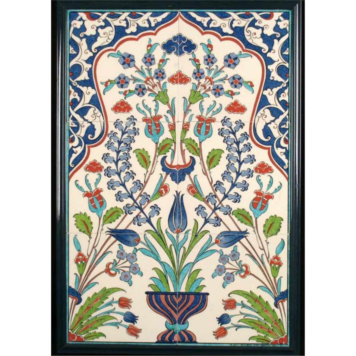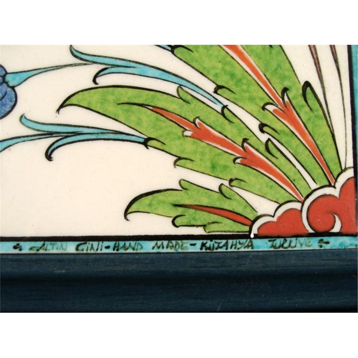 Marked: "ALTI GINI - HANDMADE - KUTAHYA TURKINE"Medium: Painted ceramic tilesImage size: inchesFraming: In 5 layer matting in dark blue/green glazed frameFrame size: 17 1/4 x 25 1/4 inches Condition: Excellent; lower left tile has a crack but it's not very noticeable