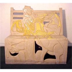 MAN WITH HORSES, garden bench made of cast resin with crushed marble, with acrylic painted highlights, 44" high 46" wide 24" deep, signed, some scratches, scuffs and hairline cracks. $1000/2000