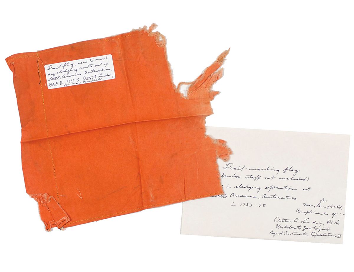 Original trail flag fabric, 11 x 10.5, signed and inscribed on an affixed label in black felt tip, “Trail flag, used to mark dog sledging route out of Little America, Antarctica. BAE II 1933–5, Alton A. Lindsey, for Mary Campbell.” Also signed and inscribed on the transmittal envelope in black felt tip, “Trail-marking flag (bamboo staff not included) used in sledging operations at Little America, Antarctica, in 1933–35. For Mary Campbell, compliments of: Alton A. Lindsay, Ph.D., Vertebrate Zoologist, Byrd Antarctic Expedition II.” In overall fine condition, with expected wear and fraying to flag.