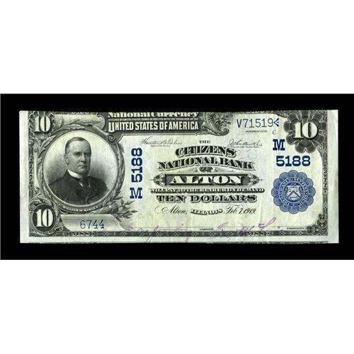 <B>Alton, IL</B></I> - $10 1902 Plain Back Fr. 632 <B>The Citizens NB</B></I> Ch. # (M)5188<BR>Although three federally chartered banks were at one time or another located here, all had failed by the end of the National Bank Note era. In fact, this institution and its sole competitor at the time, the Alton National Bank, both ceased operations on May 17, 1930. The note we offer here is a bright <B>Extremely Fine</B></I> with the trim shifted to the bottom, so that the top margin is cut in and a portion of the note below is visible.<BR><BR><b>Shipping:</b> Coin/Currency (<a target="_blank" href="http://www.heritageauctions.com/common/shipping.php">view shipping information</a>)
