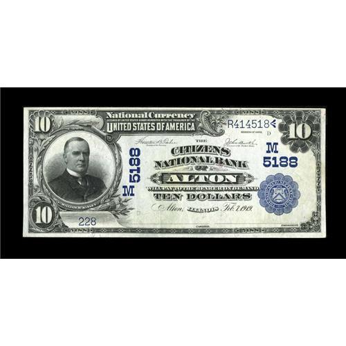 <B>Alton, IL</B></I> - $10 1902 Plain Back Fr. 632 <B>The Citizens NB</B></I> Ch. # (M)5188<BR>This note has the appearance of a higher grade, but the folds are light. The signatures have faded. <B>Very Fine-Extremely Fine.</B></I><BR><BR><b>Shipping:</b> Coins & Currency (<a target="_blank" href="http://www.heritageauctions.com/common/shipping.php">view shipping information</a>)