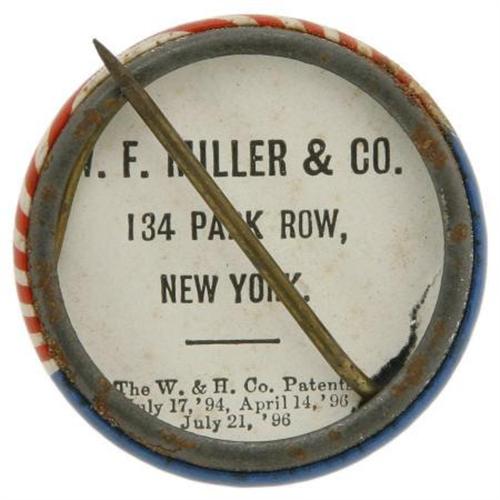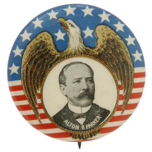 <B>Alton Parker: 1 1/4" Portrait Pin</B></I> from his 1904 campaign. The design features a portrait of Parker in a clean white circle framed by an eagle and patriotic standard. Very choice, bold example, with even a "minty" back paper.<BR><BR><b>Shipping:</b> Miscellaneous Collectibles, Smal (<a target="_blank" href="http://www.heritageauctions.com/common/shipping.php">view shipping information</a>)