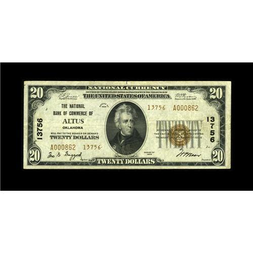 <B>Altus, OK</B></I> - $20 1929 Ty. 2 <B>The NB of Commerce</B></I> Ch. # 13756<BR>As high grade a note as we've ever seen or heard of from this better Altus bank. Bright <B>Very Fine.</B></I><BR><BR><b>Shipping:</b> Coin/Currency (<a target="_blank" href="http://www.heritageauctions.com/common/shipping.php">view shipping information</a>)