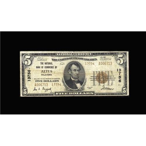 <B>Altus, OK</B></I> - $5 1929 Ty. 2 <B>The NB of Commerce</B></I> Ch. # 13756<BR>This late chartered bank only issued Type 2 notes, and currently has 12 in the latest Kelly census. Expect to see spirited bidding on this <B>Fine</B></I> example in the range of...