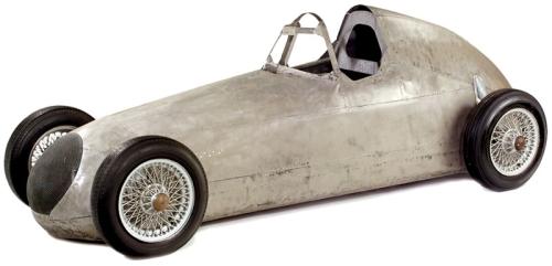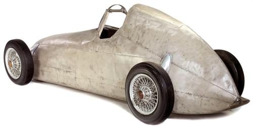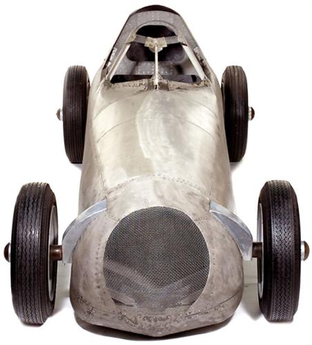 Aluminium-Karosserie des Design-Prototyp "Mercedes Silberpfeil", 1938 € 4.000,- Rennwagen-Modell im Maßstab 1:1, Prototyp zur Studie der Aerodynamik, hergestellt 1938 in Schwäbisch-Hall (nahe Stuttgart), Aluminium-Leichtbauweise, Maße: 370 x 120 x 135 cm. Original-Zustand! – 1934 war die Geburtsstunde des Mercedes-Rennwagens "Silberpfeil" mit dem Modell W25. Die Rennwagen durften nach neuer Gewichtsformel nur max. 750 kg wiegen, der Mercedes war jedoch 1 kg zu schwer. Kurzerhand wurde die übliche weiße Farbe über Nacht abgeschliffen, so daß die "silberne" Aluminium-Karosserie zu sehen war. Für Presse und Zuschauer ein spektakuläres Erscheinungsbild. Manfred von Brauchitsch gewann mit dem "Silberpfeil" beim ersten Einsatz das legendäre Nürburgring-Rennen. Der Mythos "Silberpfeil" war geboren! – Ein sensationelles Sammlungsstück und Exponat für jede anspruchsvolle Sammlung zur Automobilgeschichte! Aluminium body design-prototype of legendary race car "Mercedes Silberpfeil" in scale 1:1, made in 1938 in Schwäbisch-Hall (near Stuttgart) as an aluminium lightweight construction, size: 146 x 47 x 53 in., original condition. – A sensational collector's item and spectacular museum piece for any advanced collection to the automobile history! – (2/–) – € 5.000/8.000 – (286/8)