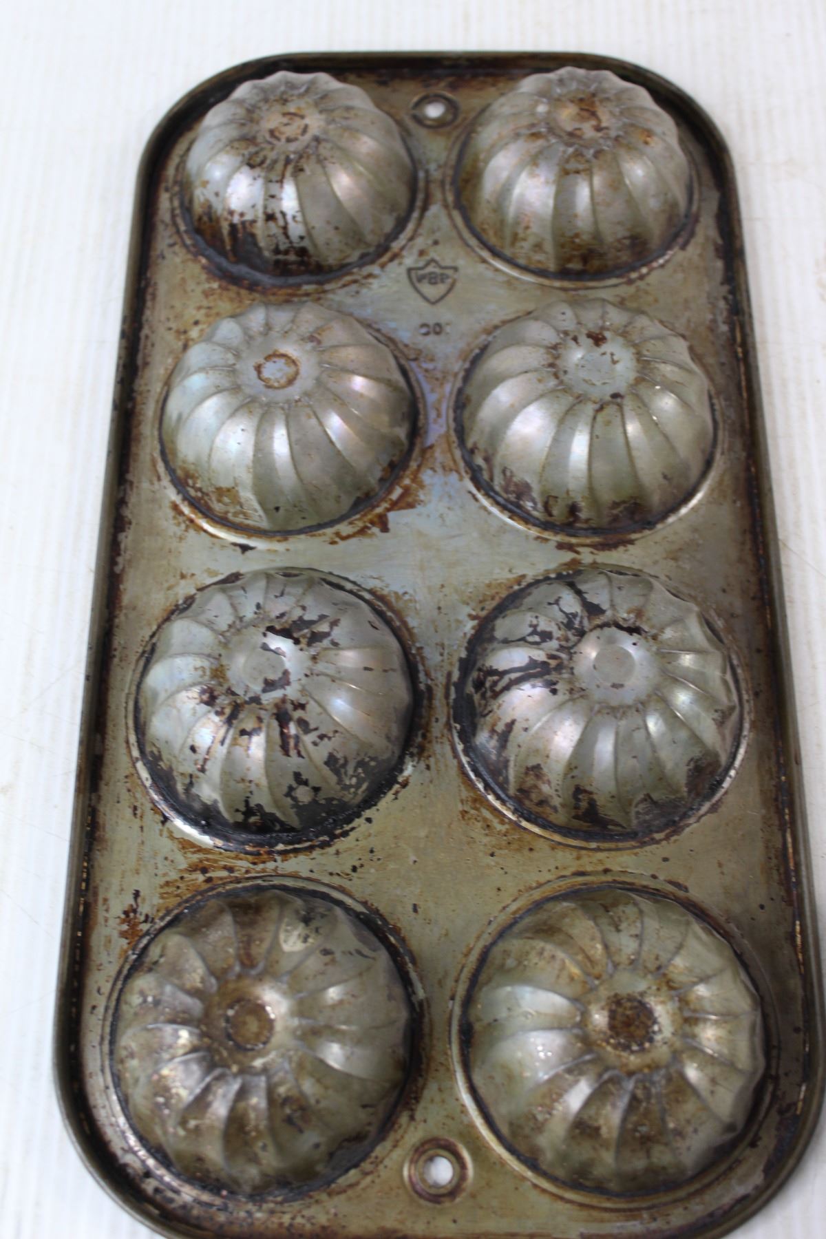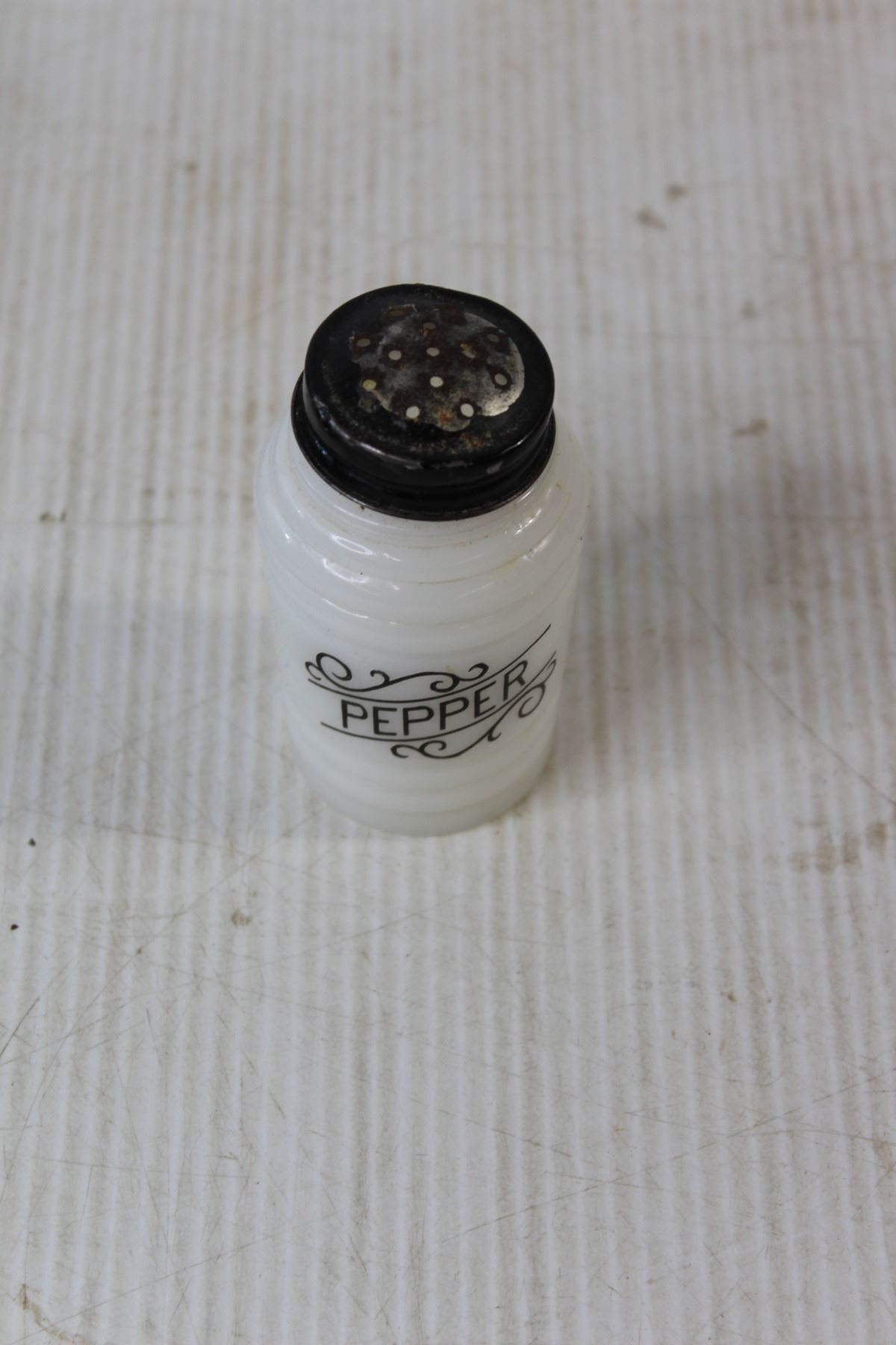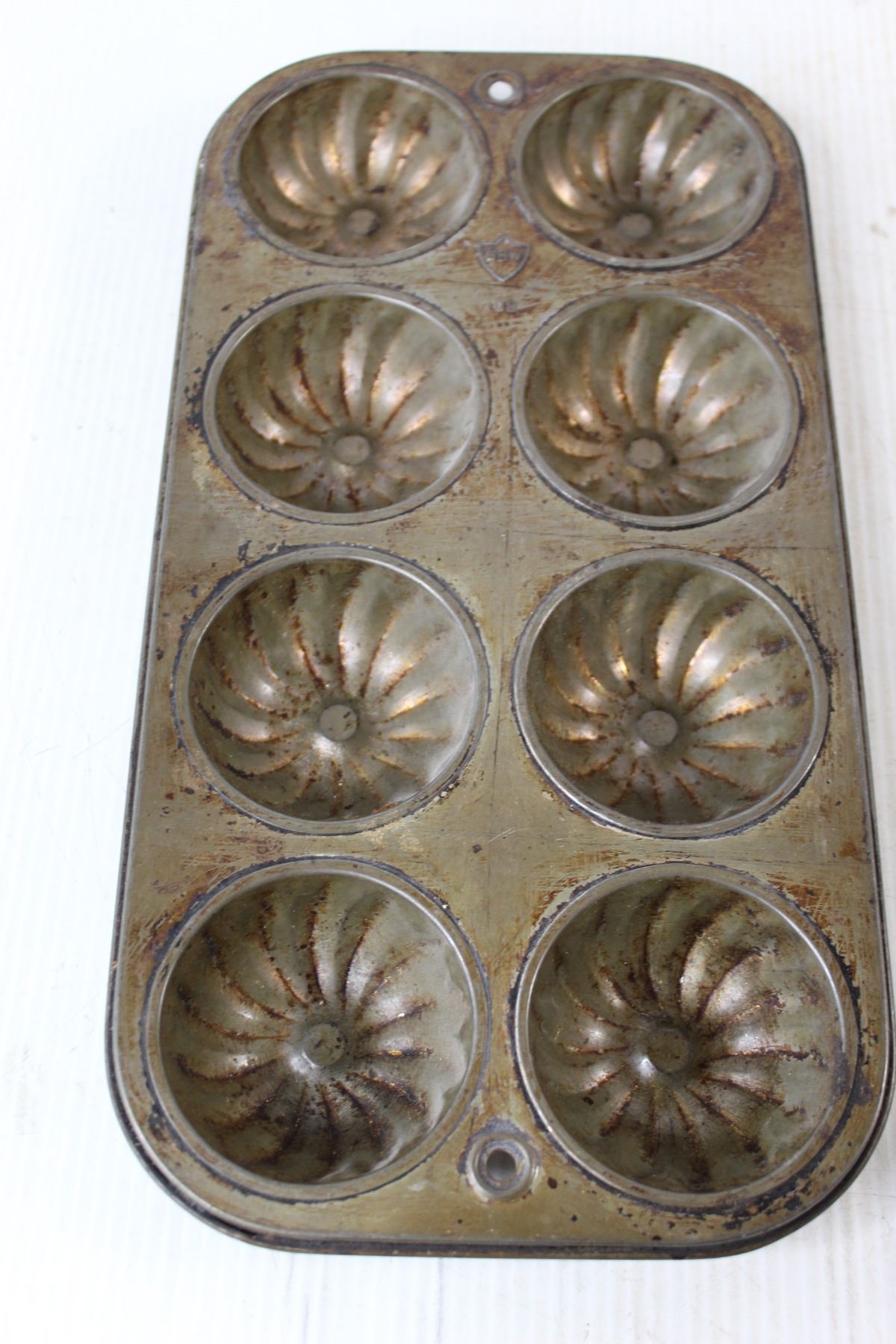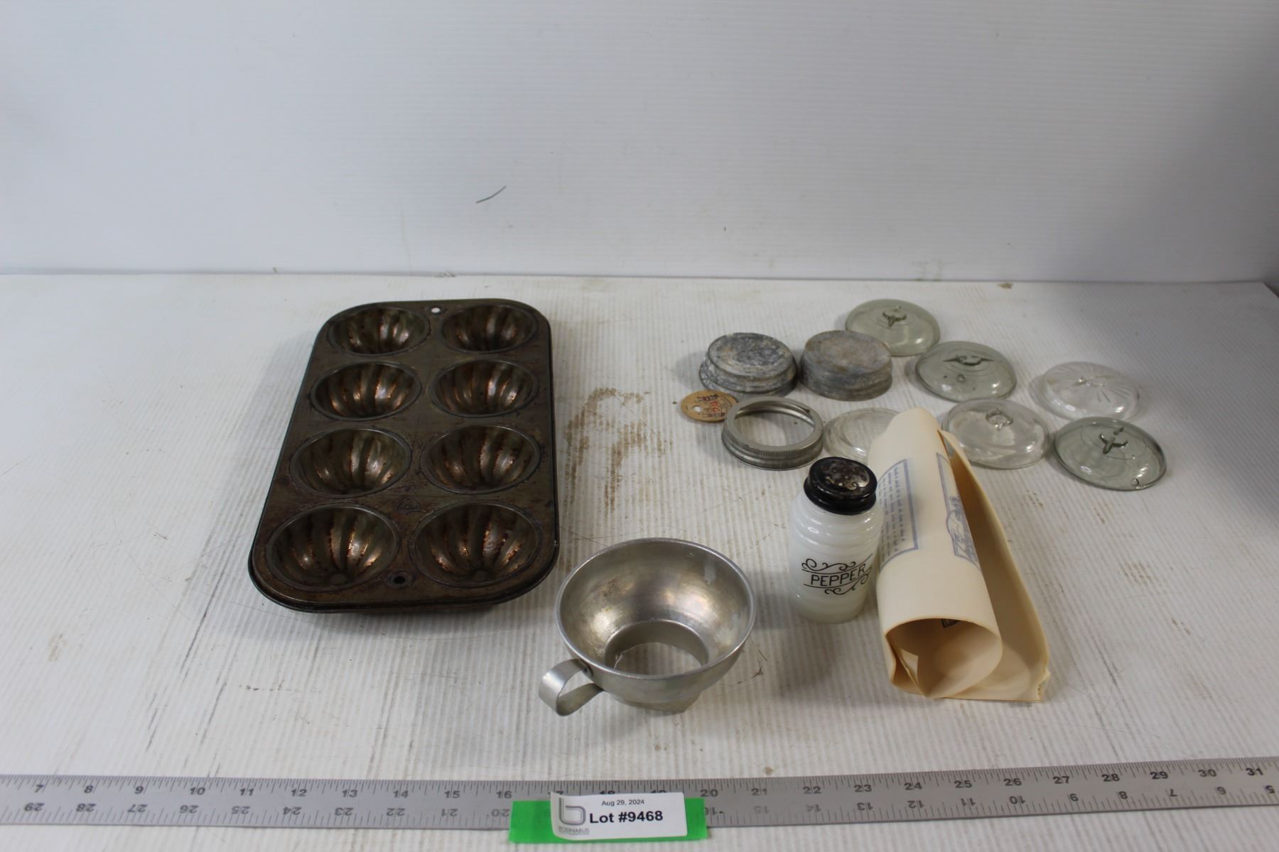 Aluminum Canning Funnel, (9) Various Jar Lids, Milk Glass Pepper Shaker, Daisy Butter Wrappers, Muffin Baking Tray