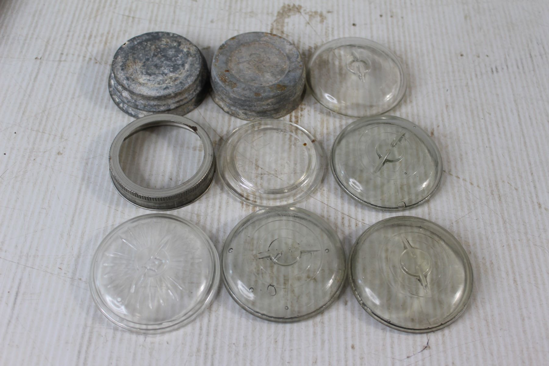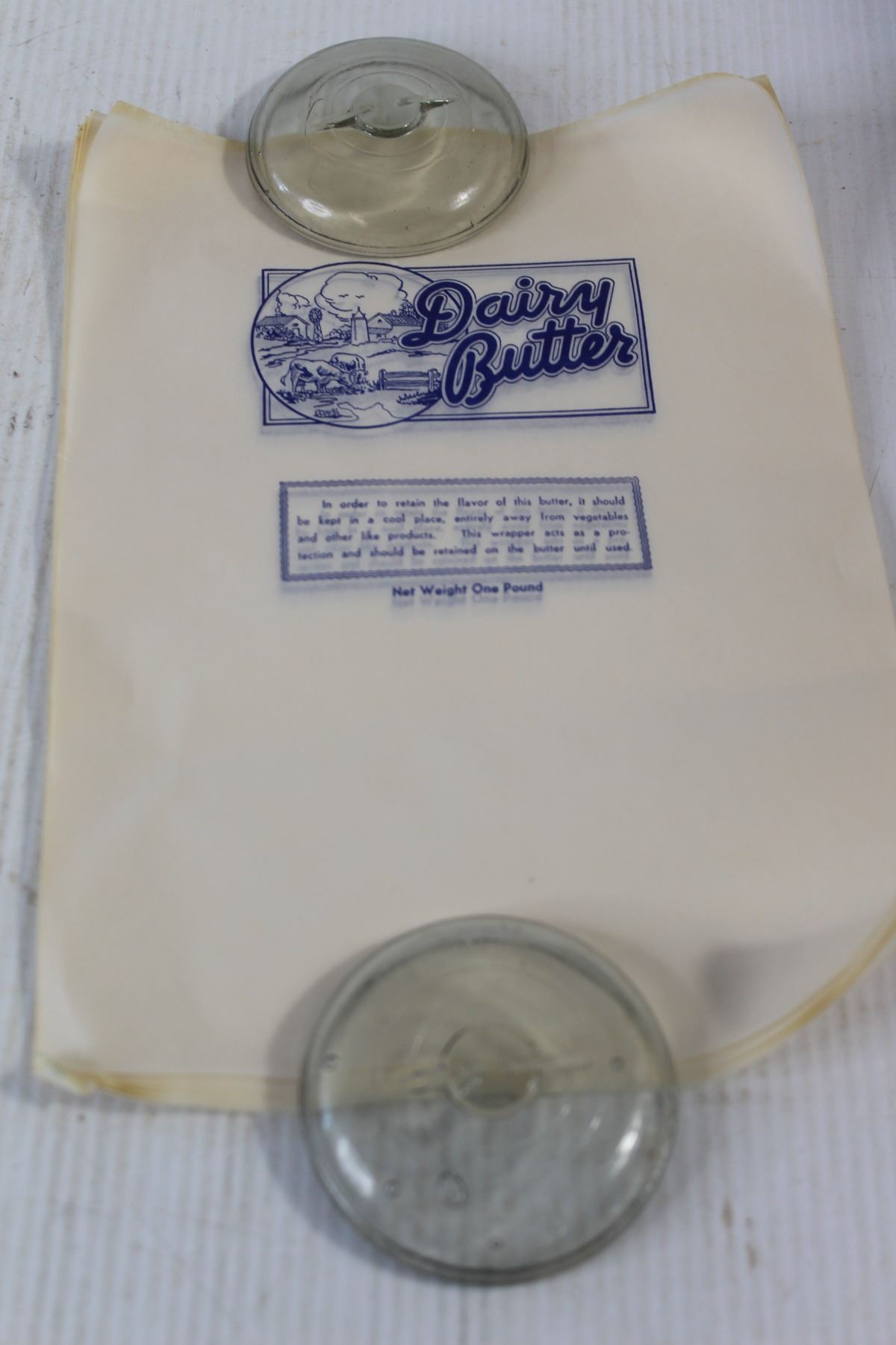 Aluminum Canning Funnel, (9) Various Jar Lids, Milk Glass Pepper Shaker, Daisy Butter Wrappers, Muff