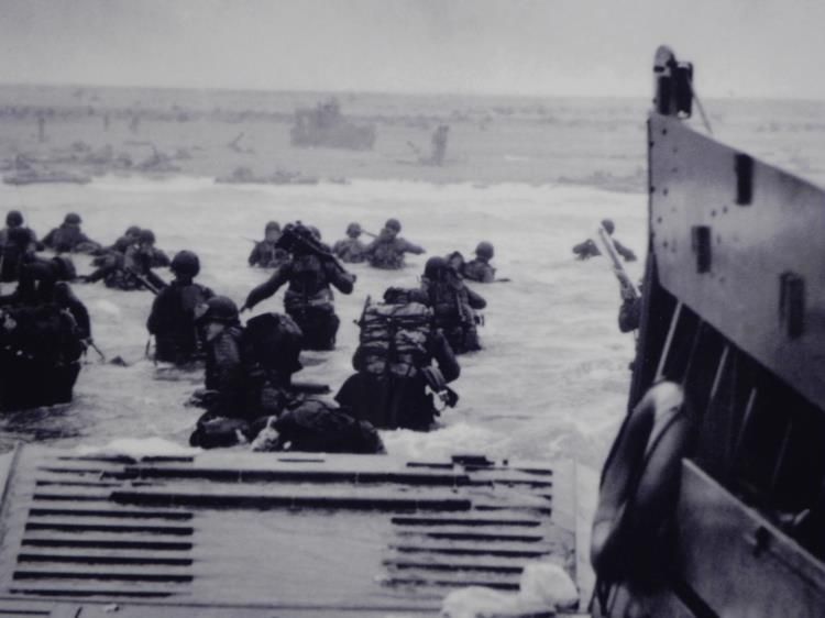 From D-Day comes this dramatic shot taken from the ship, with troops going ashore. This unusual photograph is professionally done on aluminum, which delivers a rich, glossy image. Title: U.S. Troops at Omaha Beach, Normandy, France, D-Day, 1944 Source of photo: McMahan Photo Archive Medium: Hot press printed on aluminum sheet Size: 11 x 14 inches Presentation: Ready to hang, with pressboard mount backing Condition: Excellent