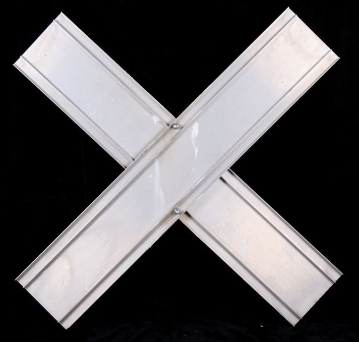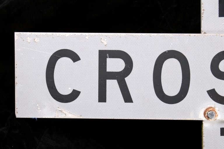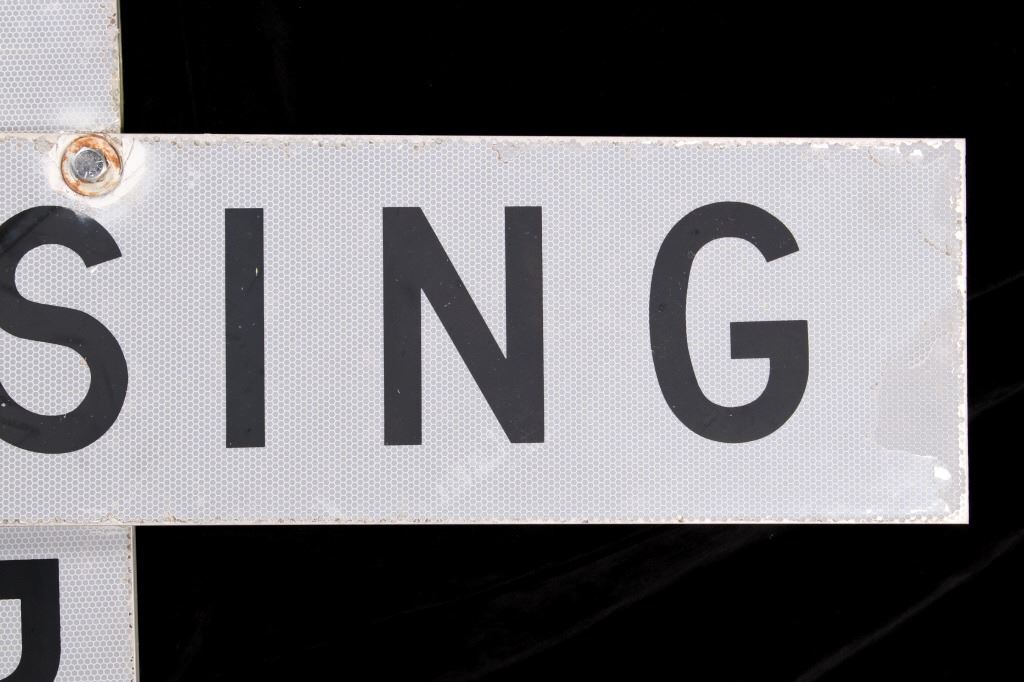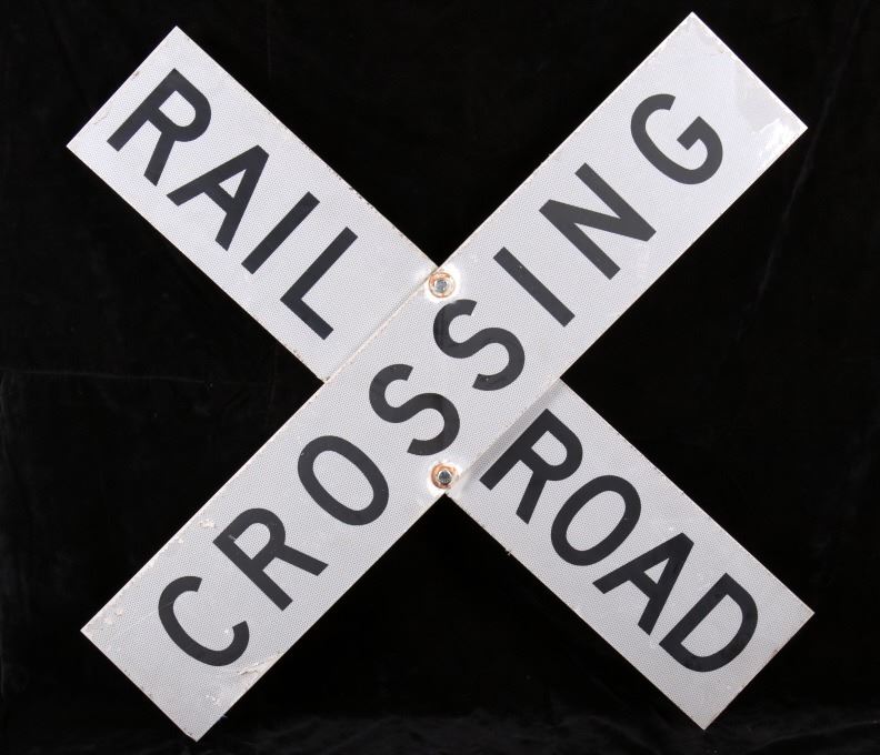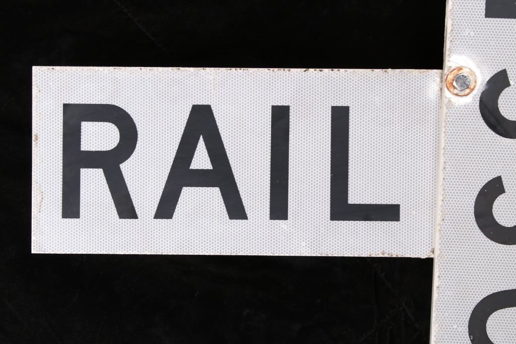 Included in this lot we have a reflective aluminum railroad crossing sign. The sign, sometimes referred to as a crossbuck, is made from aluminum panels with a reflective finish. The sign is used as a marker to indicate where railroad track intersect roadways. The sign shows good condition overall with some scuffs and wear across the piece. The sign measures 40 1/2" wide by 40" tall.