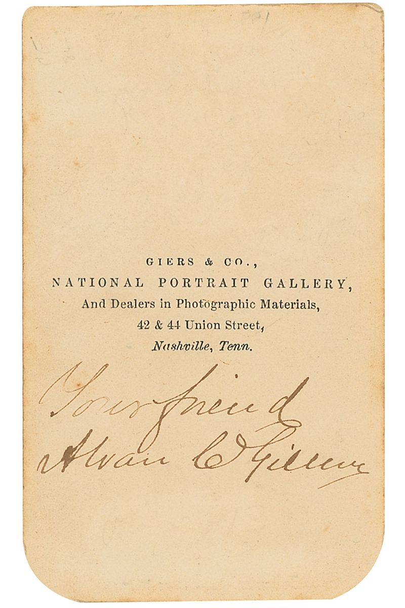 Union general (1830–1875) who participated in several battles in the Western Theater. Original 2.25 x 4 carte-de-visite photo by Giers and Company of Nashville, signed on the reverse in black ink, “Your friend, Alvan C. Gillem.” In very good condition, with clipped bottom edges and some light toning and soiling to borders and reverse.