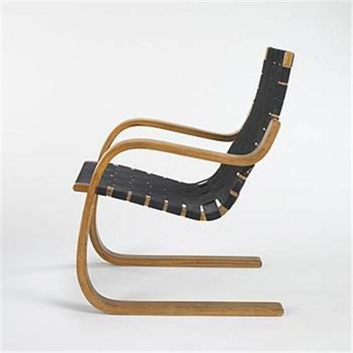 Alvar Aalto<BR>Cantilevered chair, model #406<BR>Artek<BR>Finland, 1947<BR>laminated birch, canvas<BR>24"w x 28"d x 33.75"h<BR>Literature: Alvar Aalto: Designer, Lahti, pg. 167<BR>Baldwin Kingrey: Midcentury Modern in Chicago 1947-1957, Brunetti, pg. 45<BR><BR><BR><BR>