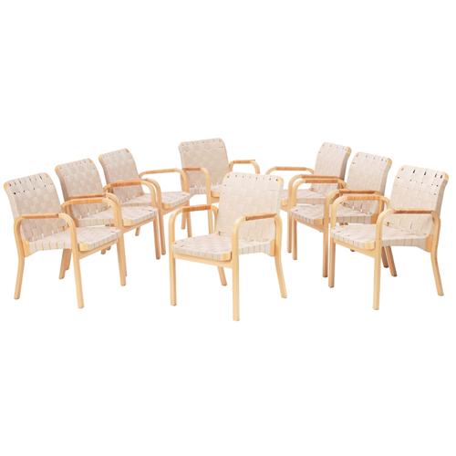 Alvar Aalto E45 dining chairs, set of eight, by Artek, Finland, solid birch frames with natural webbing and rattan-wrapped arms, original finish, unmarked, 24"w x 25.5"d x 32"h, excellent condition
