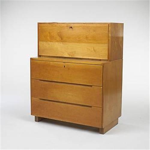 Alvar Aalto<BR>drop-front secretary<BR>Artek<BR>Finland, c. 1950<BR>birch, brass<BR>33.5"w x 19"d x 42"h<BR>Drop-front writing surface above three drawers conceals five small shelves, one central shelf, and five small drawers.<BR>Provenance: Estate of Kitty Baldwin Weese, Chicago<BR><BR><BR><BR>