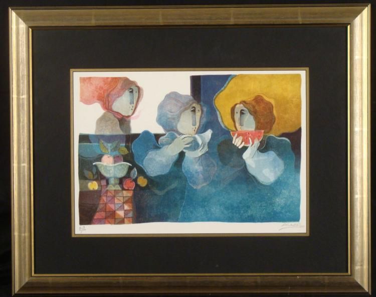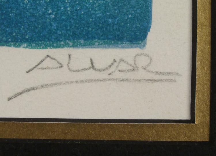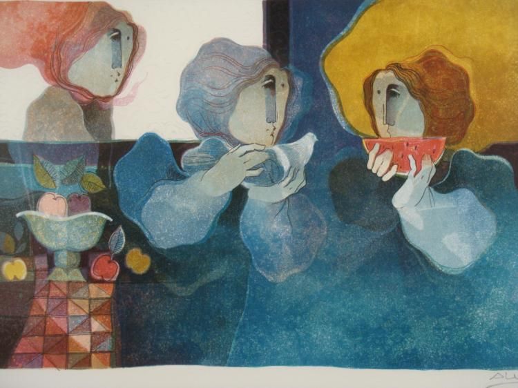 This print portrays three figures, two of whom seem to be comparing a bird and a slice of watermelon. In addition to the Cubist forms and layered colors is a segment of embossed ornamentation on white. This beautiful portrait is rich in color, texture, and form. * Artist: Alvar SunolSignature: First name in pencil, lower rightEdition: Artist's Proof, marked E/A in pencil, lower leftImage size: 11 x 16Framing: Double matted in black and gold, in brushed gold wood frameFrame size: 20 x 24 1/2 inches Condition: Excellent Biography: * Alvar (1935- ) is a Catalan artist who began oil painting at the early age of 12. By age 17 he was accepted at the Escuela Superior de Belles Artes in Barcelona. There he developed his unique style. The Museum of Modern Art in Barcelona acquired one of his paintings for its permanent Collection while he was still a student. The Instituit Francias awarded him a scholarship to study in Paris, where he spent several years. He later returned to Spain to continue working as an artist. Alvar has had individual exhibitions in Brussels, Barcelona and Madrid. His paintings, watercolors, drawings, sculpture, and prints are avidly collected around the world. *