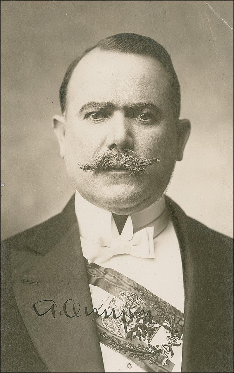 President of Mexico from 1920 to 1924. He was assassinated in 1928, shortly after winning election to another presidential term. Vintage matte-finish 3.5 x 5.5 photo of Obregon in formal attire, signed in fountain pen, “A. Obregon.” Some creasing to top corners, and light silvering to darker areas of image, otherwise fine condition. Provenance: The Barry Hoffman Collection.