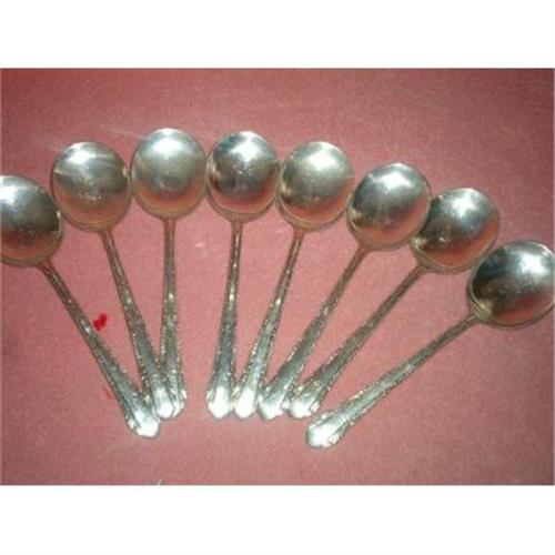 6.25" long. 8 Cream soup spoons by Alvin in the "Chased Romantique" Pattern Circa 1936. Excellent Condition.