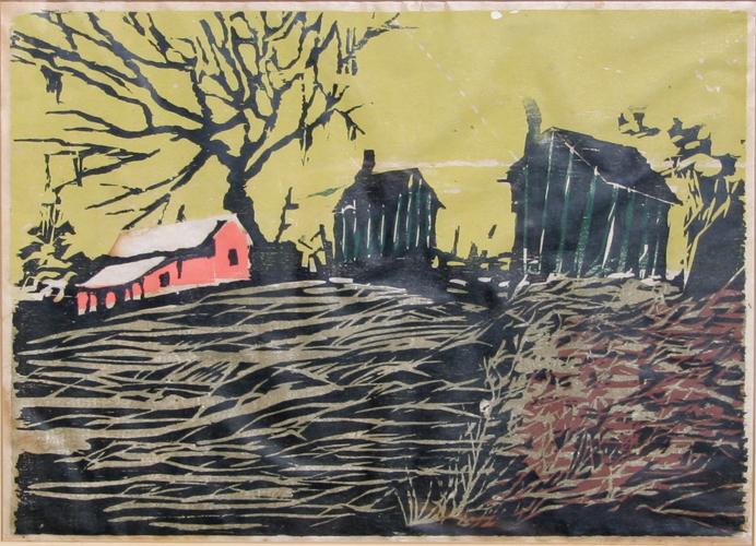 Alvin Dunkle, Red Barn in Landscape, Woodcut
