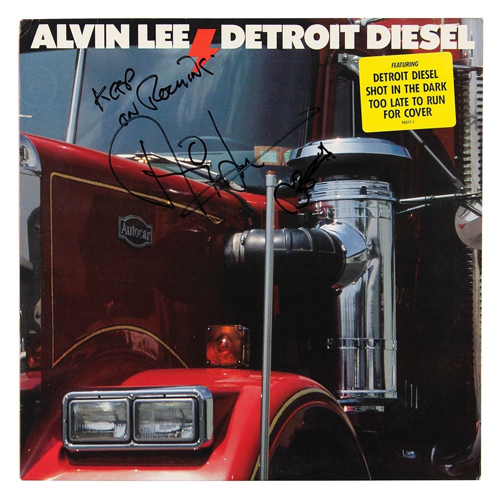 Detroit Diesel by Alvin Lee, signed on the front cover in black felt tip, "Keep on rocking, Alvin Lee," who adds a small guitar sketch. In fine condition. The record is included.