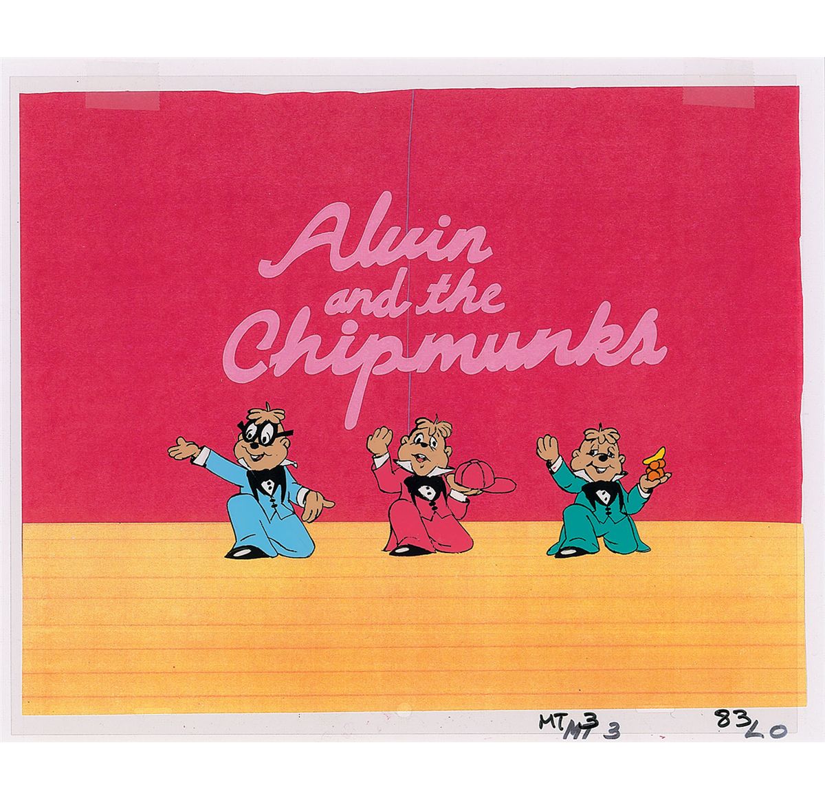 (Ruby-Spears, 1983) Original opening title cel featuring Alvin, Simon, and Theodore from the Alvin and the Chipmunks television show. The cel is placed on a matching studio copy background. Each image measures approximately 2.5 x 2.5, and shows each chipmunk on one knee at the conclusion of a musical number, with overall dimensions of 13 x 11. In fine condition.