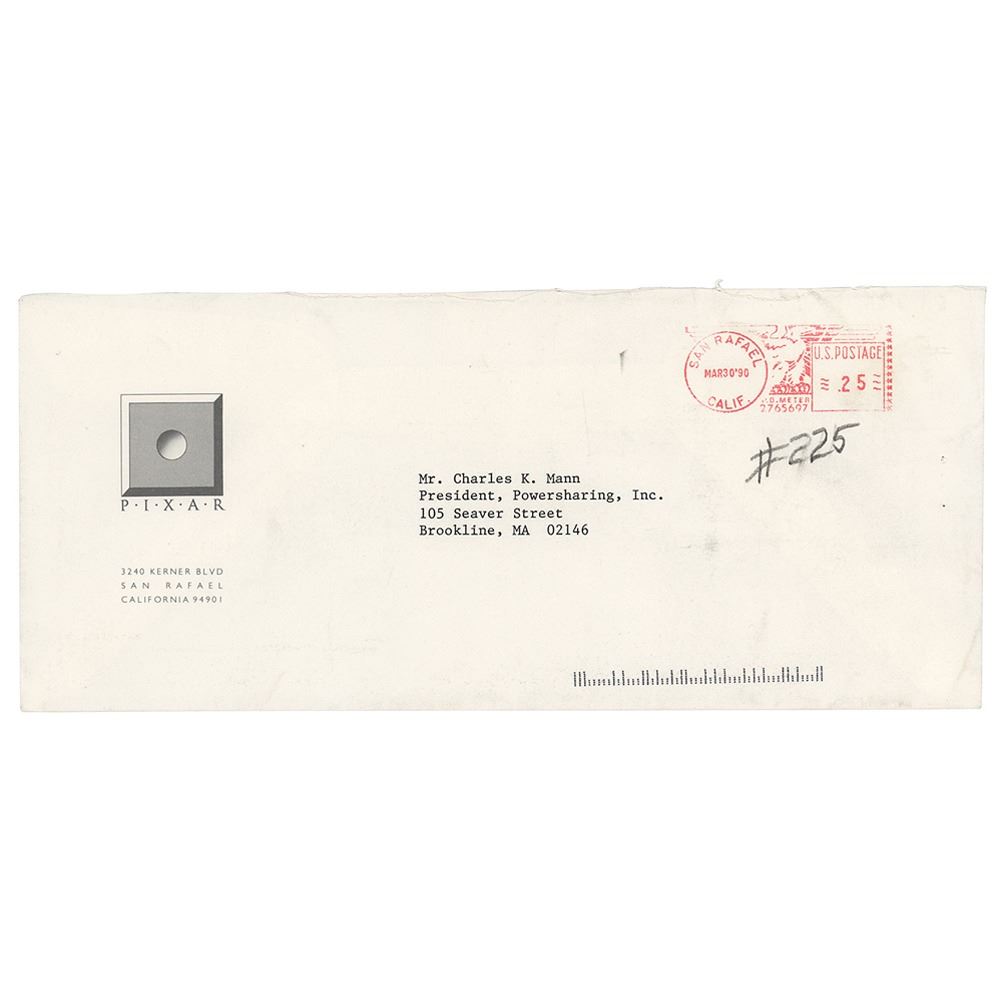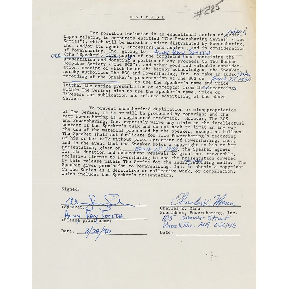 DS, one page, 8.5 x 11, March 29, 1990. Smith consents to the release of his lecture, 'Renderman and Desktop Visualization,' given at the Boston Computer Society's general meeting on March 28, 1990, as part of Charles Mann's "educational series of video & audiotapes relating to computers entitled 'The Powersharing Series.'" Signed at the conclusion in blue felt tip by Smith, printing his name and writing the date below; Smith also fills out his own name in the body of the document. Countersigned in ink by Mann. In fine condition, with a few light creases and edge toning. Accompanied by the original Pixar mailing envelope.