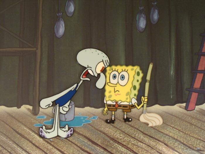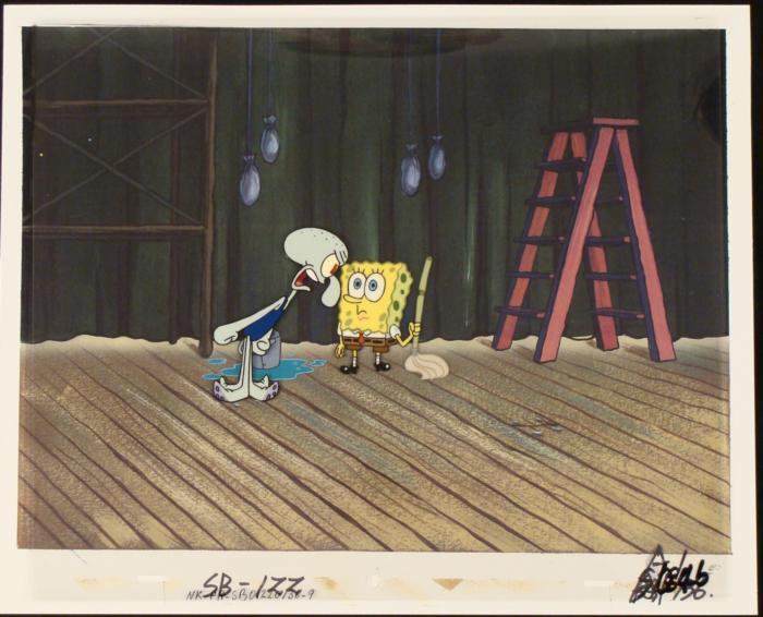 This animation cel and reproduction background are from the Nickelodeon TV show SpongeBob Squarepants. The story takes place under the deep blue sea in Bikini Bottom, where SpongeBob resides. SpongeBob, who is a yellow, porous sponge, is your typical happy-go-lucky character, as he is always cheerful and enjoys making people laugh. Patrick Star, SpongeBob's neighbor who is a starfish, is your average children's show idiot, as he boasts knowing nothing and is often getting himself into ridiculous situations. Between the homes of these two lies the home of the miserable Squidward, a squid, who is known for being grouchy and playing tricks on SpongeBob and Patrick. Both SpongeBob and Squidward work at the Krusty Krab, a fast food business run by the greedy money-loving Mr. Krabs, a crab, the arch rival of the evil, possibly misunderstood, Plankton. Another neighbor, Sandy Cheeks, an athletic squirrel who normally wears an astronaut's space suit, was introduced in "Tea at the Treedome." She spends most of her time inventing and experimenting. Why is Squidward always mad at SpongeBob?Original Printed Background and Animated Cel Overall Size of Background: 11" x 13 1/2" Overall Size of the Cel: 10 1/2" x 12 1/2" Very good condition This is an original hand-painted cel set-up used in the production of an episode of "SpongeBob SquarePants." Each one-of-a-kind set-up represents a slight change in position of the characters. When individually photographed and projected in rapid succession, the images appear to move.