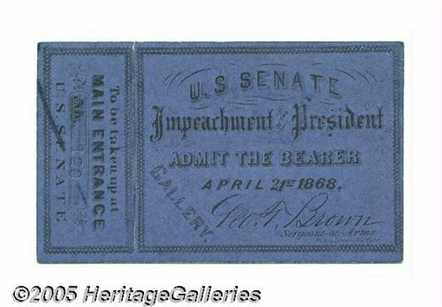 <B>Always-popular Ticket to President Andrew Johnson's 1868 Impeachment Trial</B></I> Original stub still attached, not the case with most examples. This dark blue color is uncommon, as is the stamped-in "120" on the stub, indicating that this was an actually-issued (but not used) ticket. Both sides in great condition. 4.75" x 2.875". Lot:258