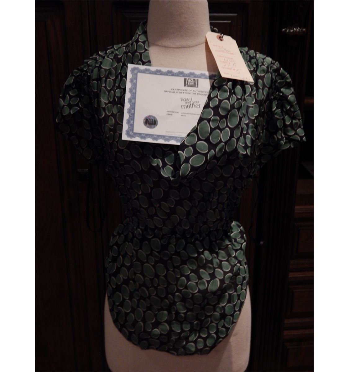 Green and black blouse worn by Alyson Hanngan in the television series How I Met Your Mother. Obtained directly from 20th Century Fox with original wardrobe tag and studio issued COA.