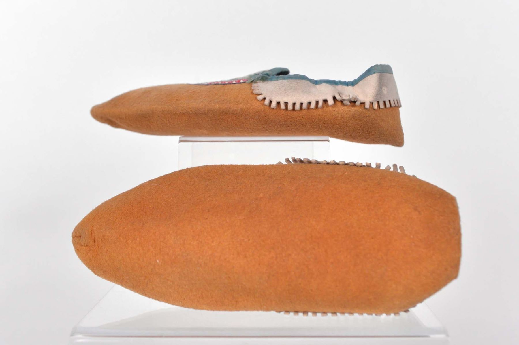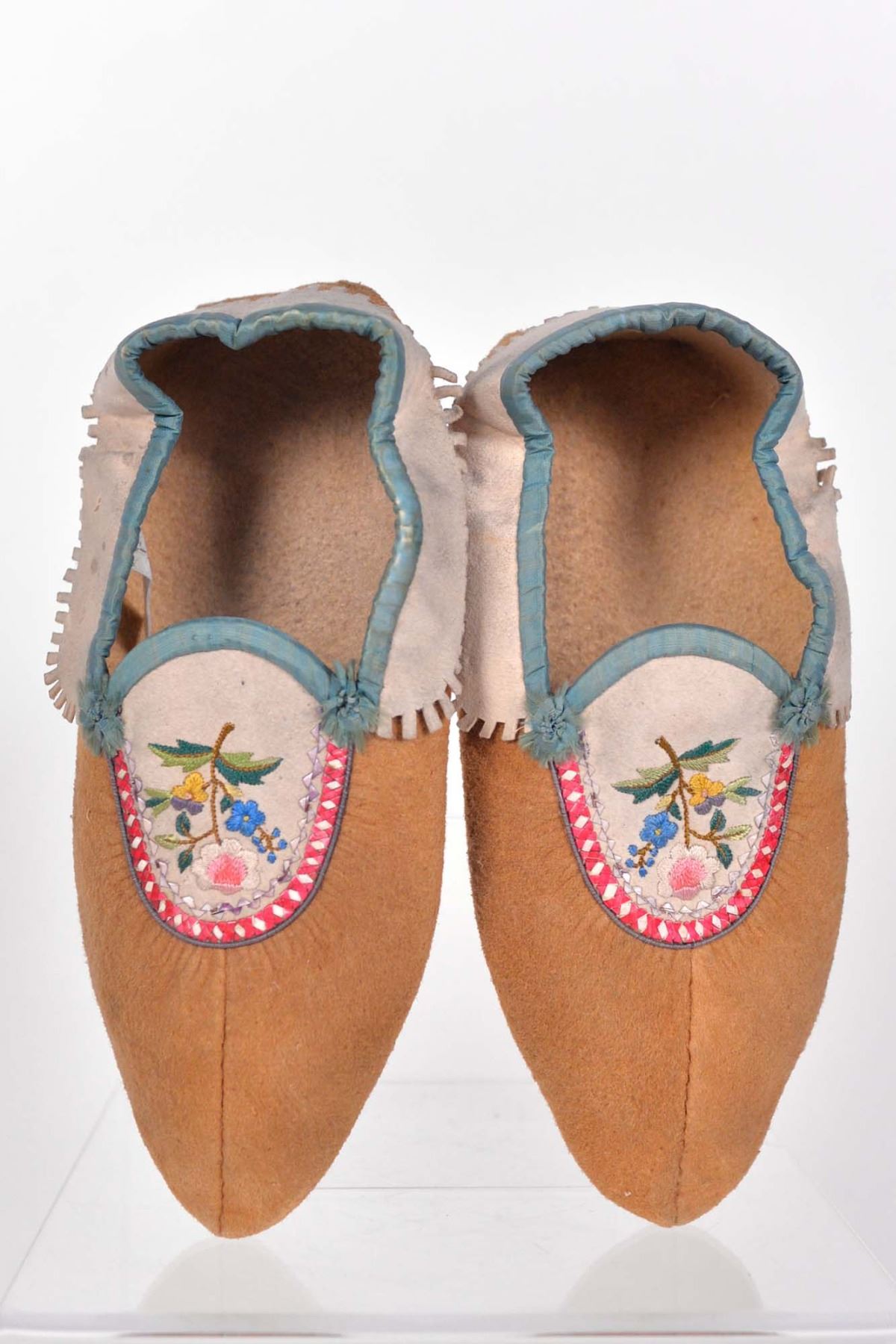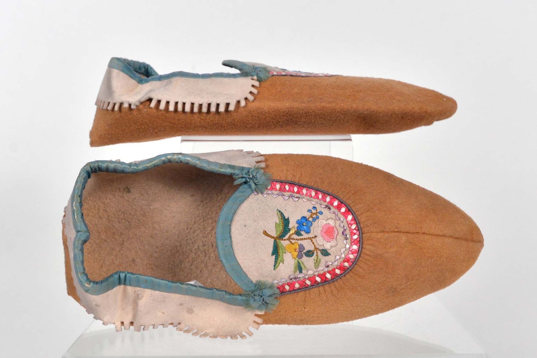 Pair of summer moose skin moccasins decorated with silk thread and porcupine hair embroidery