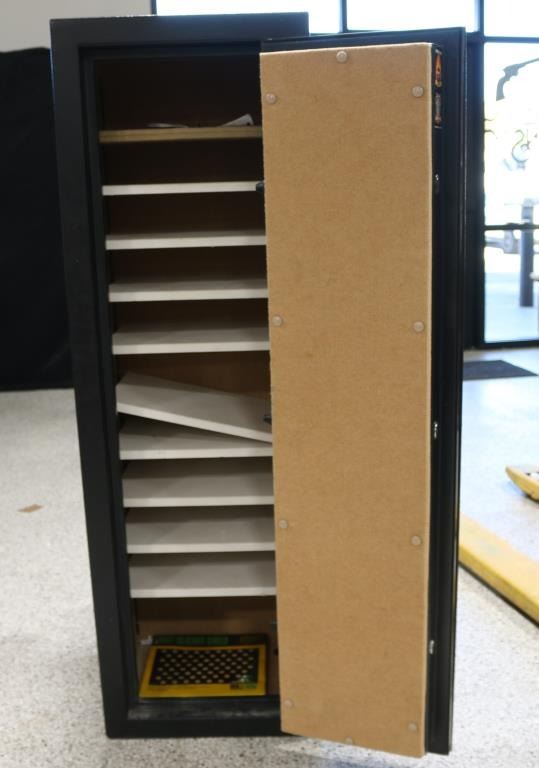 Model TF5517. Black painted finish, rated for 30 mins @ 1200 degrees, tan carpet-lined, custom shelves installed. Measures 55 1/4" tall x 17 3/4" wide x 16" deep. Very good condition.