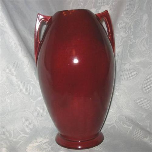 Maroon colored Amaco Pottery Vase, with high glaze, artist "MTF". Made in the USA, 1931-1938. Excelent condition.