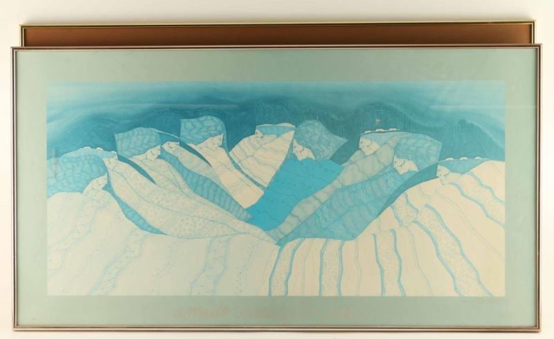 #1) Full Color Print Measures 23" X 39" Framed, #2) Two Toned Blue/white Print Measures 21" X 40" Framed.