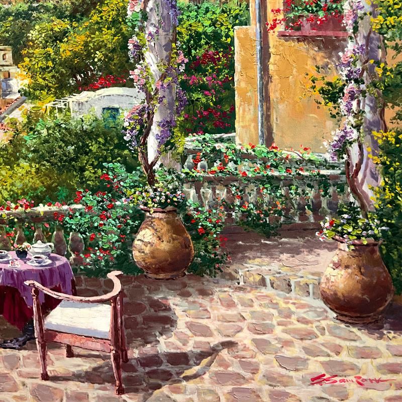 "Amalfi Patio" is a hand embellished limited edition serigraph on stretched canvas by Sam Park, numbered and hand signed by the artist. Includes Letter of Authenticity. Measures approx. 30" x 40" (image). There is minor wear on the corners and edges (chipping and/or hairline cracks) that will be concealed when framed.
