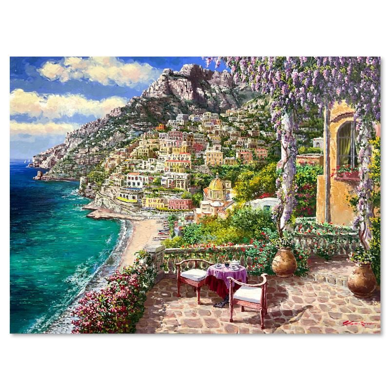 "Amalfi Patio" is a hand embellished limited edition serigraph on stretched canvas by Sam Park, numbered and hand signed by the artist. Includes Letter of Authenticity. Measures approx. 30" x 40" (image). There is minor wear on the corners and edges (chipping and/or hairline cracks) that will be concealed when framed.