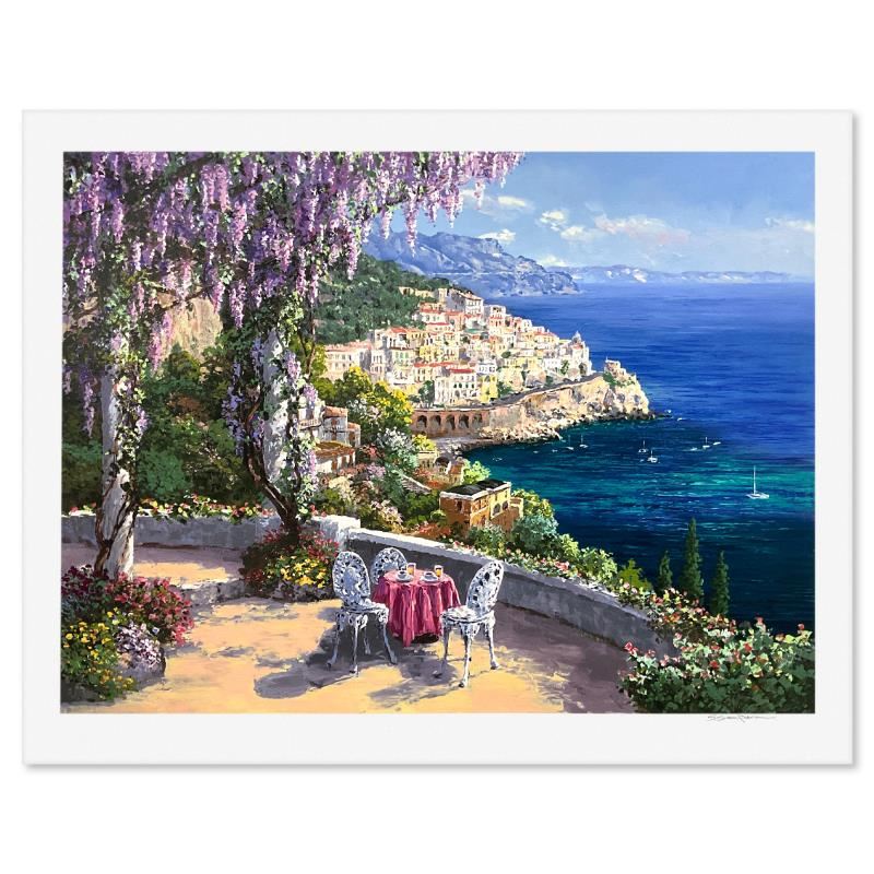 "Amalfi Patio" is a limited edition printer's proof serigraph on paper by Sam Park, numbered and hand signed by the artist. Includes Letter of Authenticity. Measures approx. 34.5" x 44" (border), 30" x 40" (image).