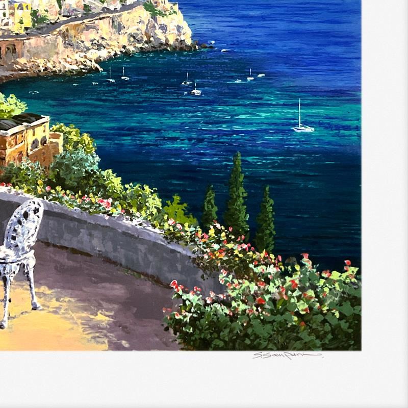 "Amalfi Patio" is a limited edition printer's proof serigraph on paper by Sam Park, numbered and hand signed by the artist. Includes Letter of Authenticity. Measures approx. 34.5" x 44" (border), 30" x 40" (image).