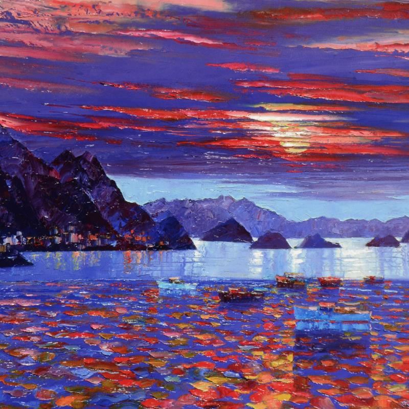 "Amalfi Sunset" is a limited edition texturized giclee on board by Howard Behrens (1933-2014), numbered and bears the artist's authorized signature. A texturized giclee is a proprietary medium where a mold is made from the original oil painting as a basis for the giclee. Includes Certificate of Authenticity. Measures approx. 36" x 24" (image).